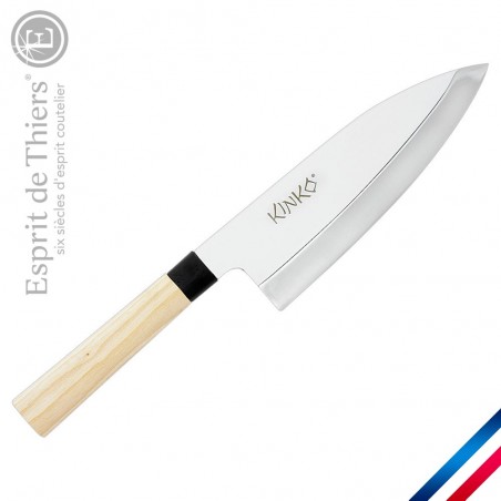 La collection "Kinko" invite au voyage en reprenant le style et l'esprit qui ont fait le succès des lames japonaises. Le manche est en frêne (symbole de la sagesse et du bonheur), une essence précieuse et robuste. Il est doux et agréable au toucher comme à la préhension. La forme arrondie et la qualité de la lame inox, forgée dans la masse confèrent au Kinko une coupe rasoir nette et précise.