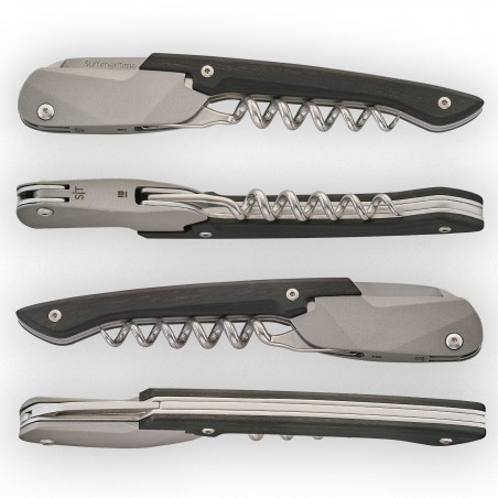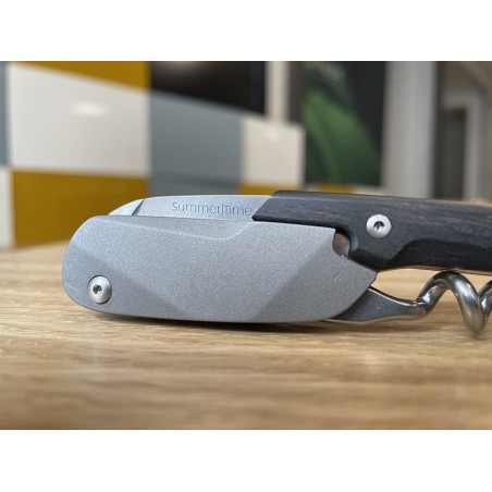 Pièce maîtresse avec ses plans inclinés, le crapaud est façonné dans un bloc d’acier inoxydable. Élément signature des sommeliers SummerTime®, il est pourvu d’un retour guidé, pour un repli très agréable après usage. La mèche tire-bouchon est composée d’un fil conique comprenant cinq spires pour extraire sans risque tous les bouchons en liège, y compris les plus grands. Le sommelier SummerTime® « Chet » est en finition sablé huilé. Les cotes sont en bois ébène. Il est livré dans une boîte à l’effigie de la marque SummerTime®, avec certificat d’authenticité.
